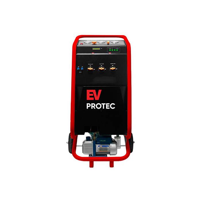 EV PROTEC ACCO R134A AC Recharge Service Machine is Fully automatic and is capable of recovering, evacuation, leak testing, charging and oil drain/inject-putting A/C lubricant back into the system.